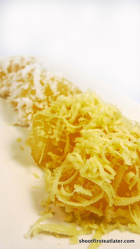 What makes their peachy peachy so good is that it’s firm, not so sweet and covered with cheese. The traditional pisti pisti is usually covered with grated coconut. I like cheese better. It gives a nice contrast in flavor and texture to the peachy peachy. Here’s how I eat this. Open the refrigerator, open the styro container, pinch a piece and pop it into my mouth. The cold slippery texture of sweet cassava and the bits of salty cheese blend into my mouth as I chew standing in front of the refrigerator. Next, close the door and walk away.