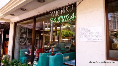 A friend invited us for lunch at Yakiniku Sakura Restaurant. Let me get straight to the point. The interiors and ambiance are a 2 (di pwede kay Erap!) but the food is a solid 8. Don’t mind the heat, awful lighting and furniture and just dig in.