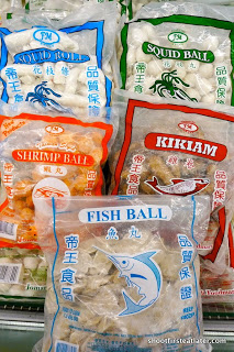 This isn’t strange at all. Makro has a long freezer selling all kinds of frozen balls. I bought a pack of each for use in my pancit canton, a noodle dish. These are also very good just fried and eaten with sweet chili sauce.