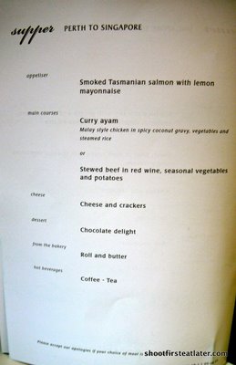 We took flight SQ216 and that meant leaving Perth at 1:05 am and arriving in Singapore at 6:25 am. This was the meal served on the flight.
