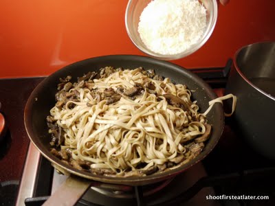 5. Add the pasta straight from the pot. No need to drain the pasta. (When boiling pasta don’t forget to add a generous amount of salt to the water before adding the pasta. Do not add oil.) If the pasta with mushrooms is a bit dry you can add some pasta water to the pan.