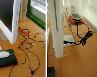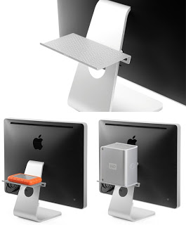 I love this new product for the iMac. Backpack is an adjustable metal shelf you put behind the iMac or Cinema Display to help you organize your desk and keeps your external hard drive, iPhone, etc. out sight but still within reach.