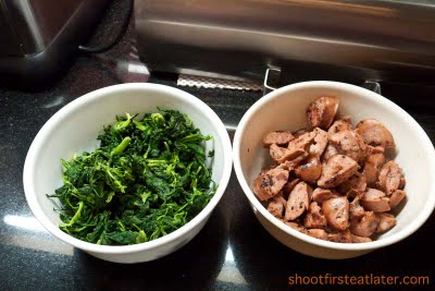 3. Heat olive oil in a pan and add the minced garlic. Saute til lightly browned. Add spinach, sausages and pesto. You can also add some red pepper flakes for more heat. Turn off heat when the mixture is thoroughly mixed.