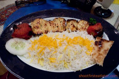 Royal joojeh kabab are skewers of chicken breast marinated in safforn & yogurt. I tried a piece and found it very tasty but a bit dry.