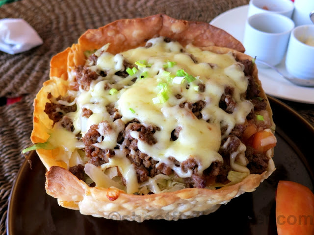 I enjoyed my salad a lot. The oodles of melted cheese definitely added tons of flavor. The ground beef was very flavorful and with the tomato salsa in the salad I didn’t add any more dressing or condiments. I specially liked the thin and crunchy taco shell. I’m sure this wasn’t a healthy salad but what the heck I was on vacation!