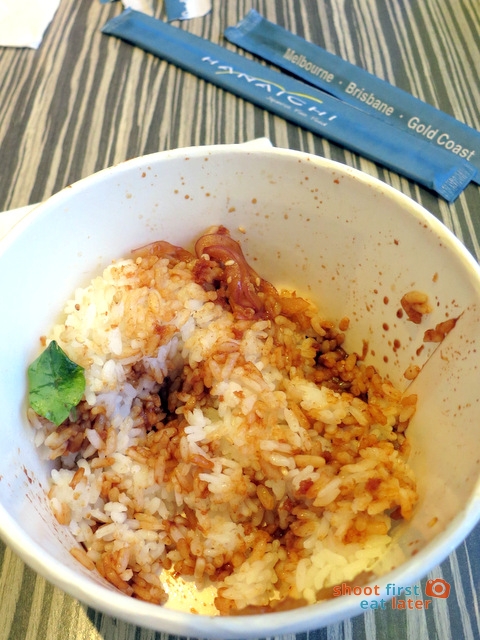 Unlike at a Japanese fast food chain in Manila which serves a few slices of beef on a big bowl of rice where the ratio of rice to beef is about 90 to 10, Hanaichi was quite generous with their protein. Half rice and half chicken was just perfect for me.