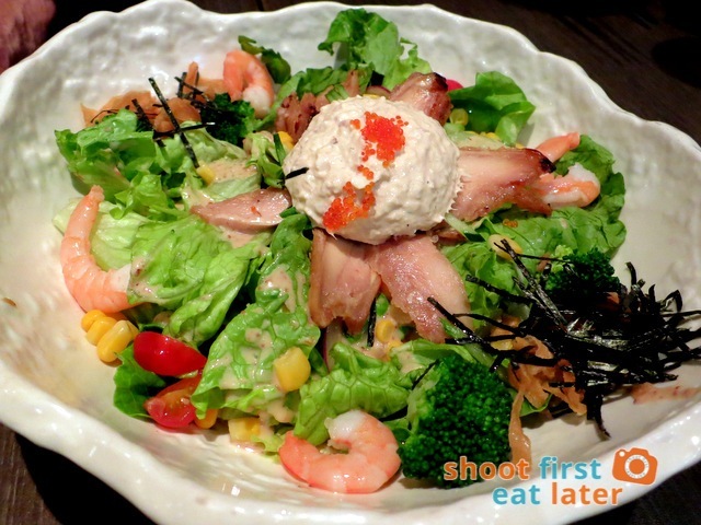 The salad was typical of a Japanese salad with some unexpected toppings like nori (seaweed) and roast pork.