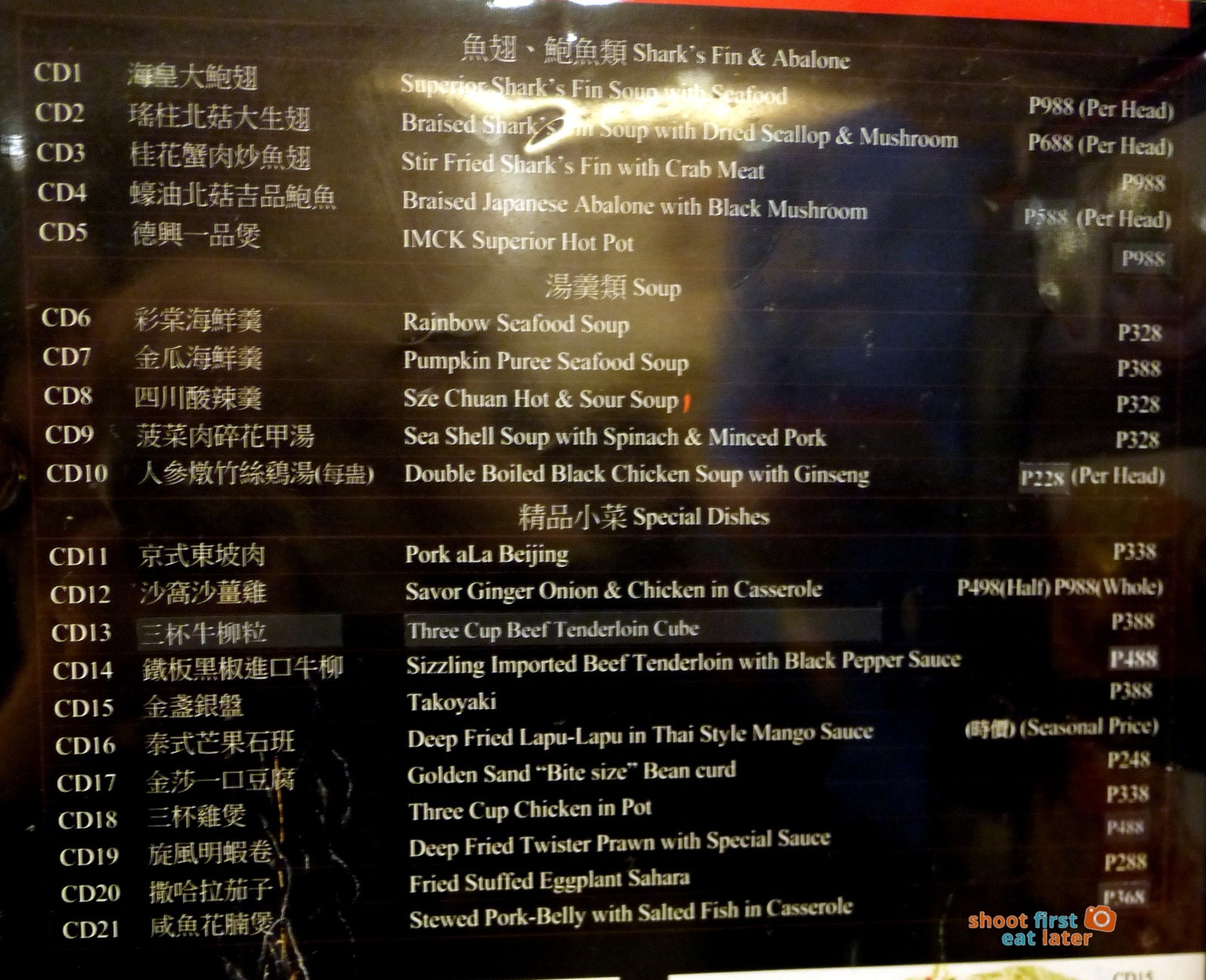 IMC Kavino sounds like a strange name for a Chinese restaurant but it actually made sense since IMC means International Master Chef, a recognition he won in 2003, and the chef’s name is Kavino Lao. Before opening IMC Kavino with Wilson Tan, Chef Lao used to cook at Heritage Hotel in Manila.