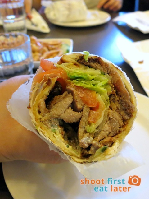 Simply stated a souvlaki is a Greek pita sandwich filled with small pieces of meat and some vegetables. We ordered 3 huge lamb souvlakis to share. It was a good thing we had the souvlakis cut in half since it was so big. I don’t think I can ever finish one whole by myself. Well, maybe if I didn’t eat the whole day I can.