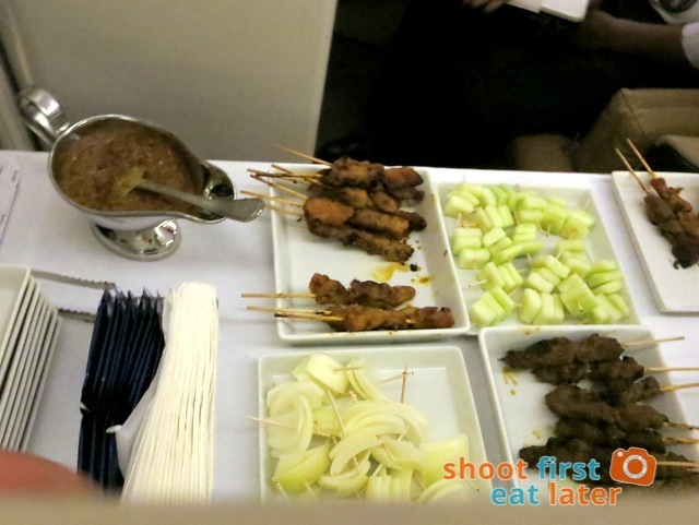 The flight attendants pushed a trolley through the aisle to serve us appetizers of satay.