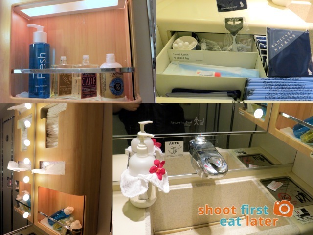 There was a compartment in the corner which held the headphones and menu. I took those out to store my bottled water and toiletries pouch. You can see from the bottom left picture there was a lot of crumbs inside. The cleaning crew missed it.