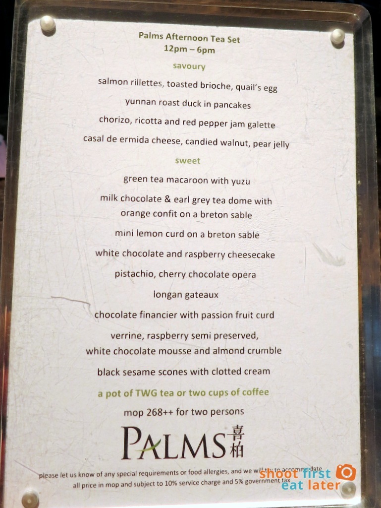 I didn’t eat much lunch because our room at the Sheraton Macao Hotel included an afternoon tea for two at the Palms Lounge just off the entrance to the hotel.