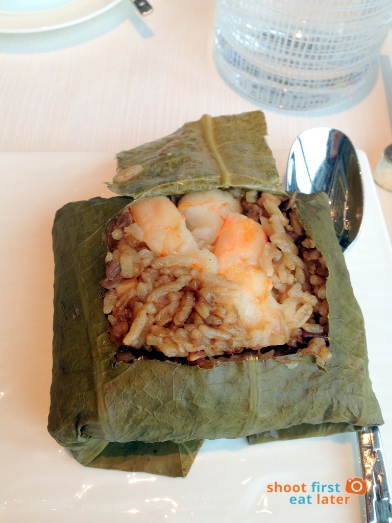 My friends know I don’t eat white rice. Since this was colored brown, wrapped in a leaf and mixed with lots of diced abalone and shrimp I ate it all with gusto!! Seriously this small package was a meal in itself.