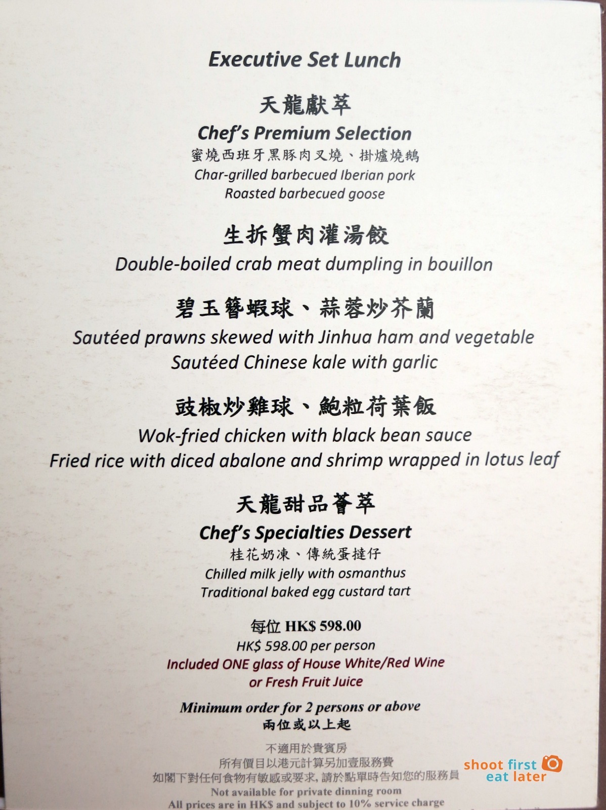 The average price for dim sum was HK$80-100 for 2-3 pieces and there were so many to choose from. To remove the stress from choosing we decided to have the Executive Set Lunch since it looked pretty good and my objective (Iberian pork) was there.