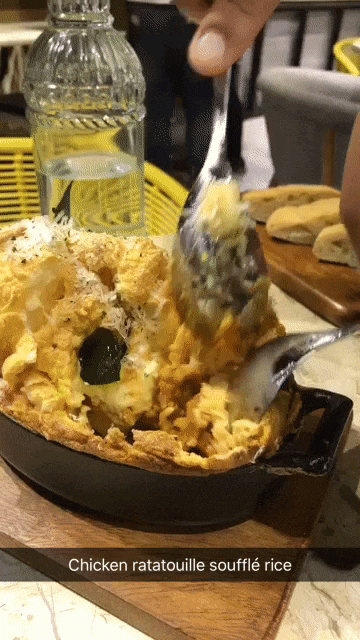The next three rice dishes are what Le Souffle is all about. Different rice mixtures covered with fluffy scrambled eggs and a puffed egg topping. We each had our own favorites. My friend loved the subtle flavors of the squid ink rice while I liked the more aggressively flavored chicken ratatouille rice. My friend’s hubby joined us and polished off all our leftovers. He liked the spicy Japanese beef curry rice the best.