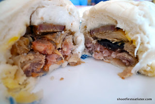 Cua pao is an open faced siopao with pork belly, preserved green mustard vegtable and sweet ground peanuts as filling. I don’t know where cua pao came from because I haven’t seen it in Hong Kong, China or Singapore. Maybe it’s a Filipino invention?